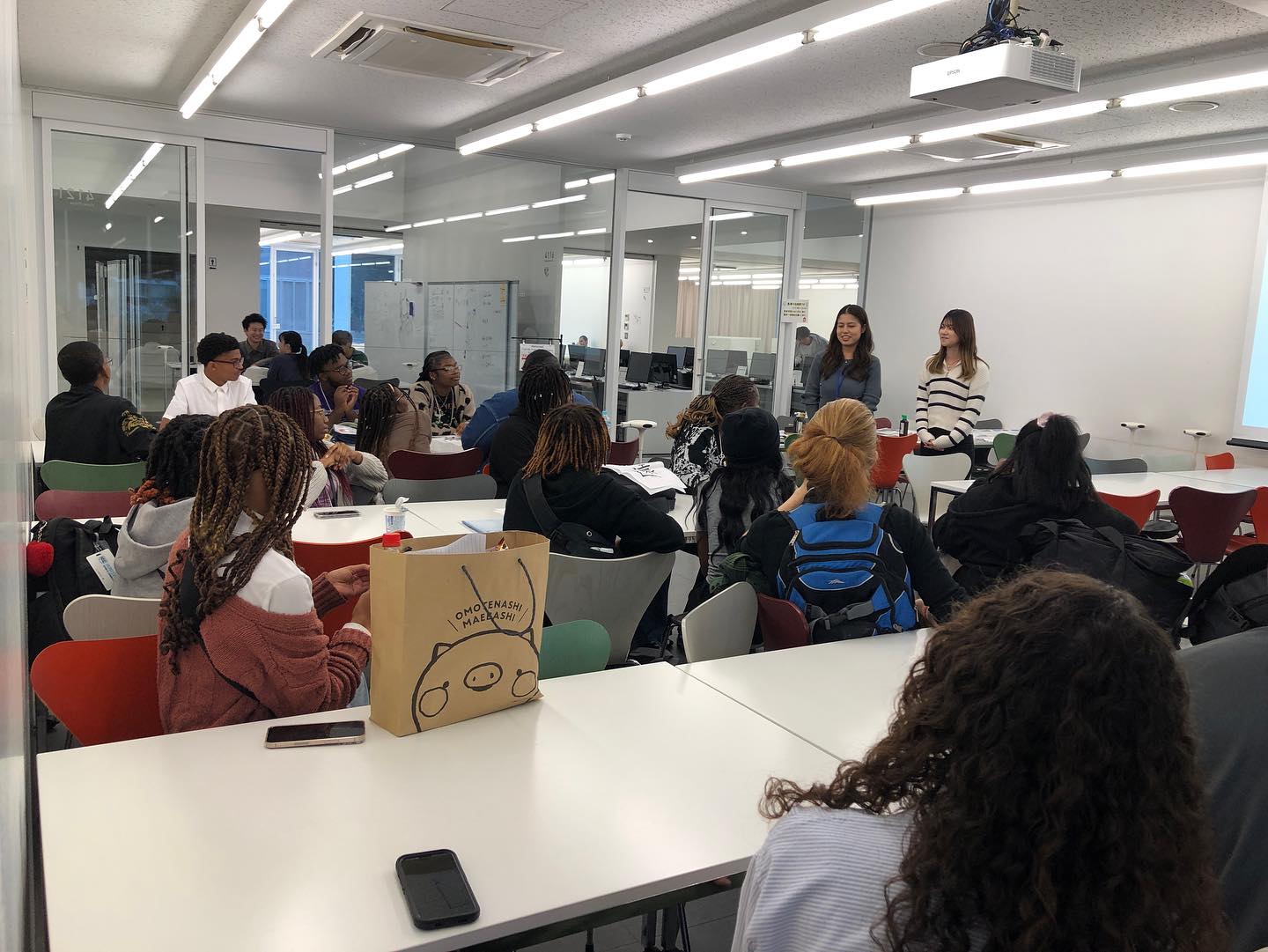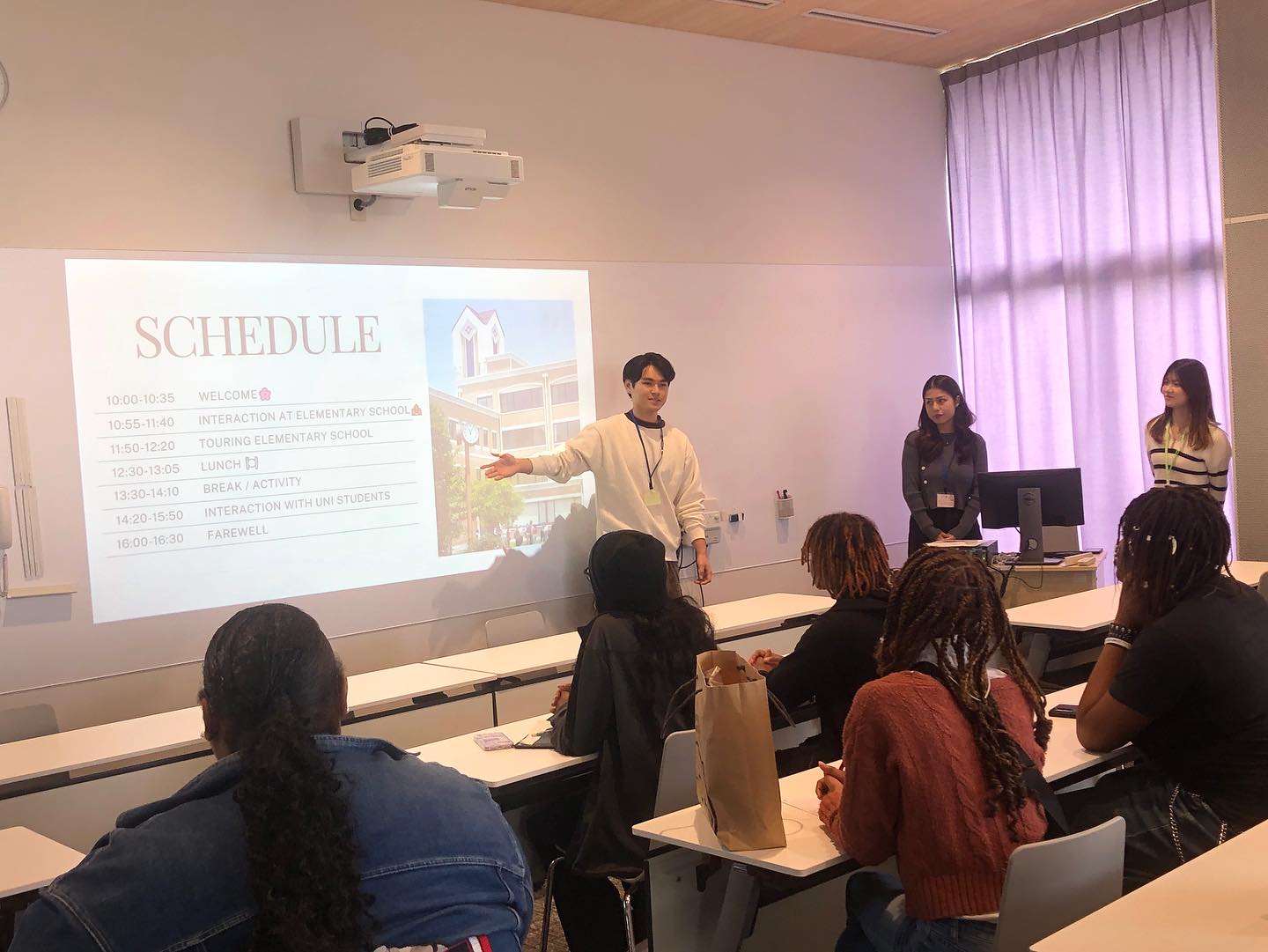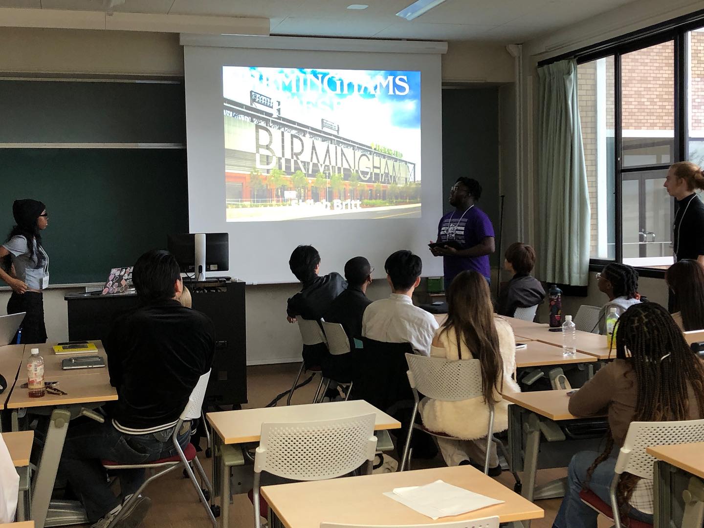 午後は本学の「Speaking of Japan」の授業に参加し、学生たちがグループごとに準備してきたテーマで、英語によるプレゼンテーションやディスカッションを行いました。後半には、バーミングハムの高校生たちが、自分たちの街の歴史や文化を紹介し、互いの国への理解を深める貴重な機会となりました。
