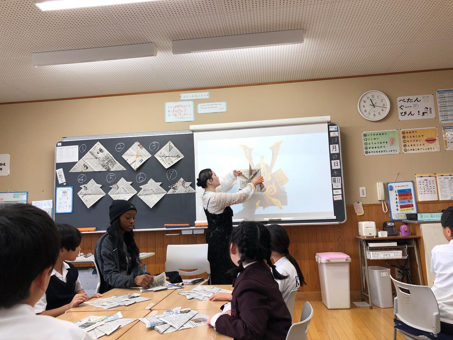 午前中は共愛学園小学校で2年生と一緒に折り紙で兜を作ったり、給食を囲んだりしながら、子どもたちとの交流を楽しみました。小学校ではちょうど最近、「英語でインタビューをしよう!」という授業が行われたようで、英語で名前や好きな映画を質問するなど、積極的にコミュニケーションを取る姿も見られました。