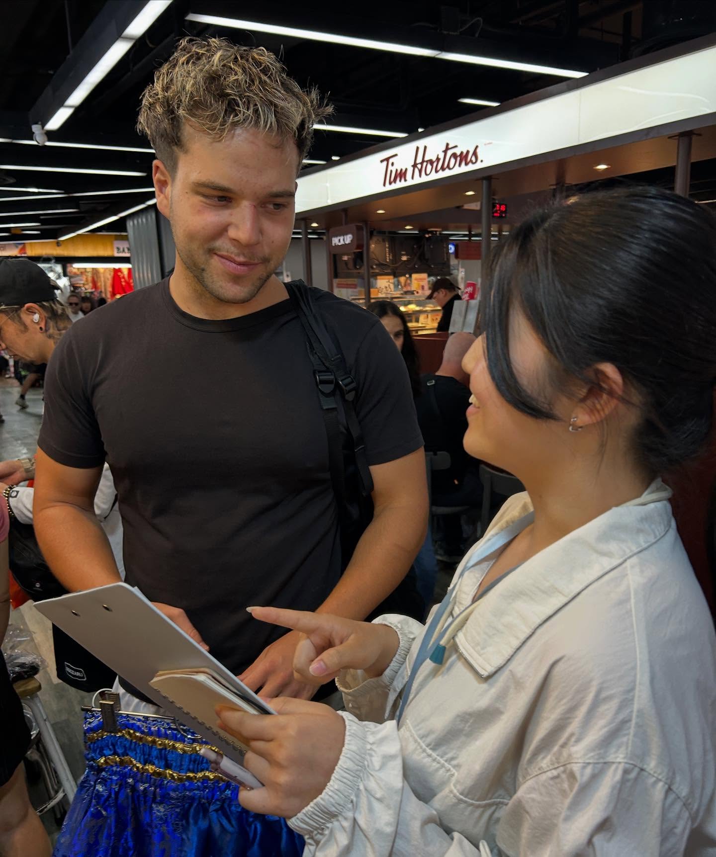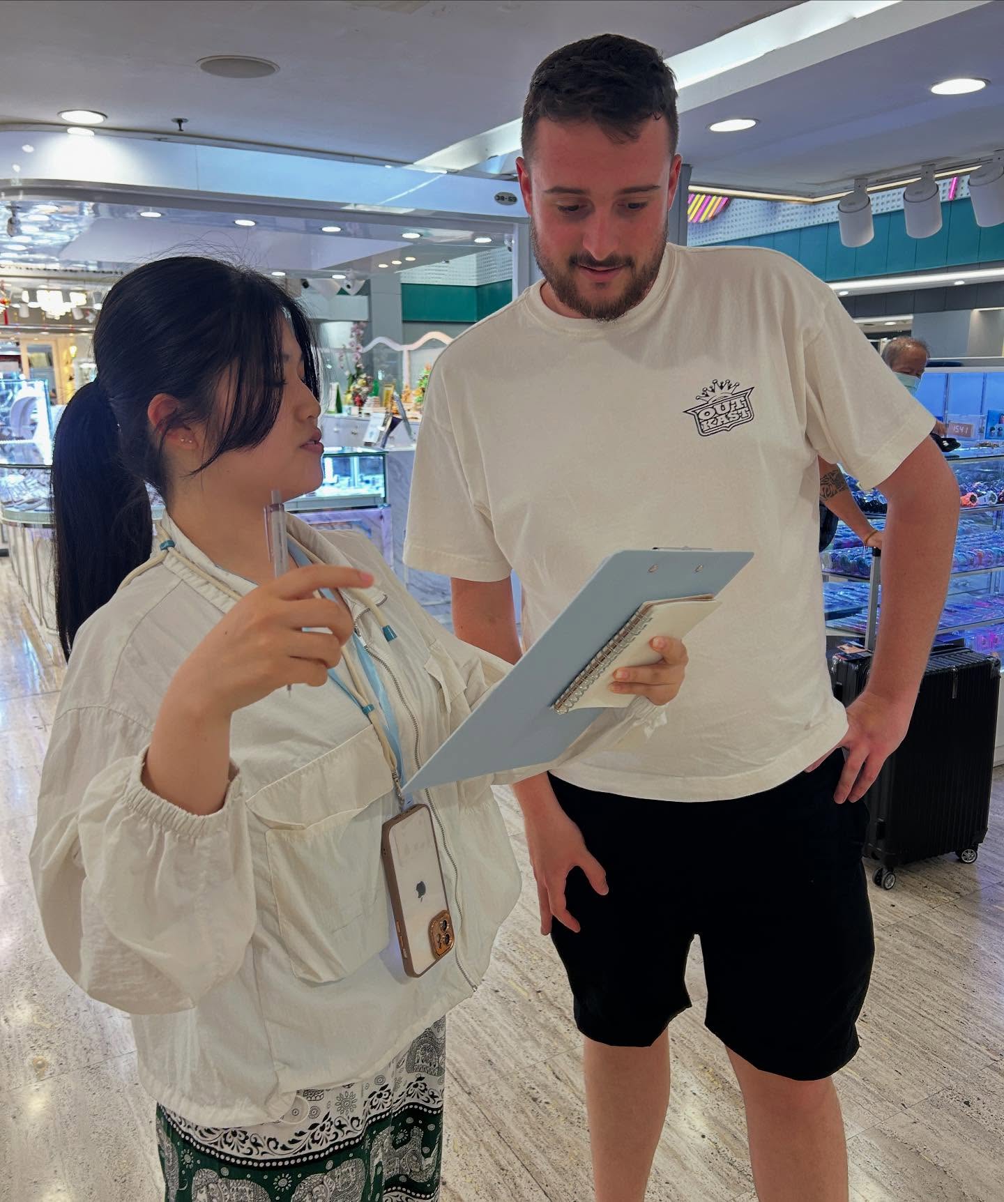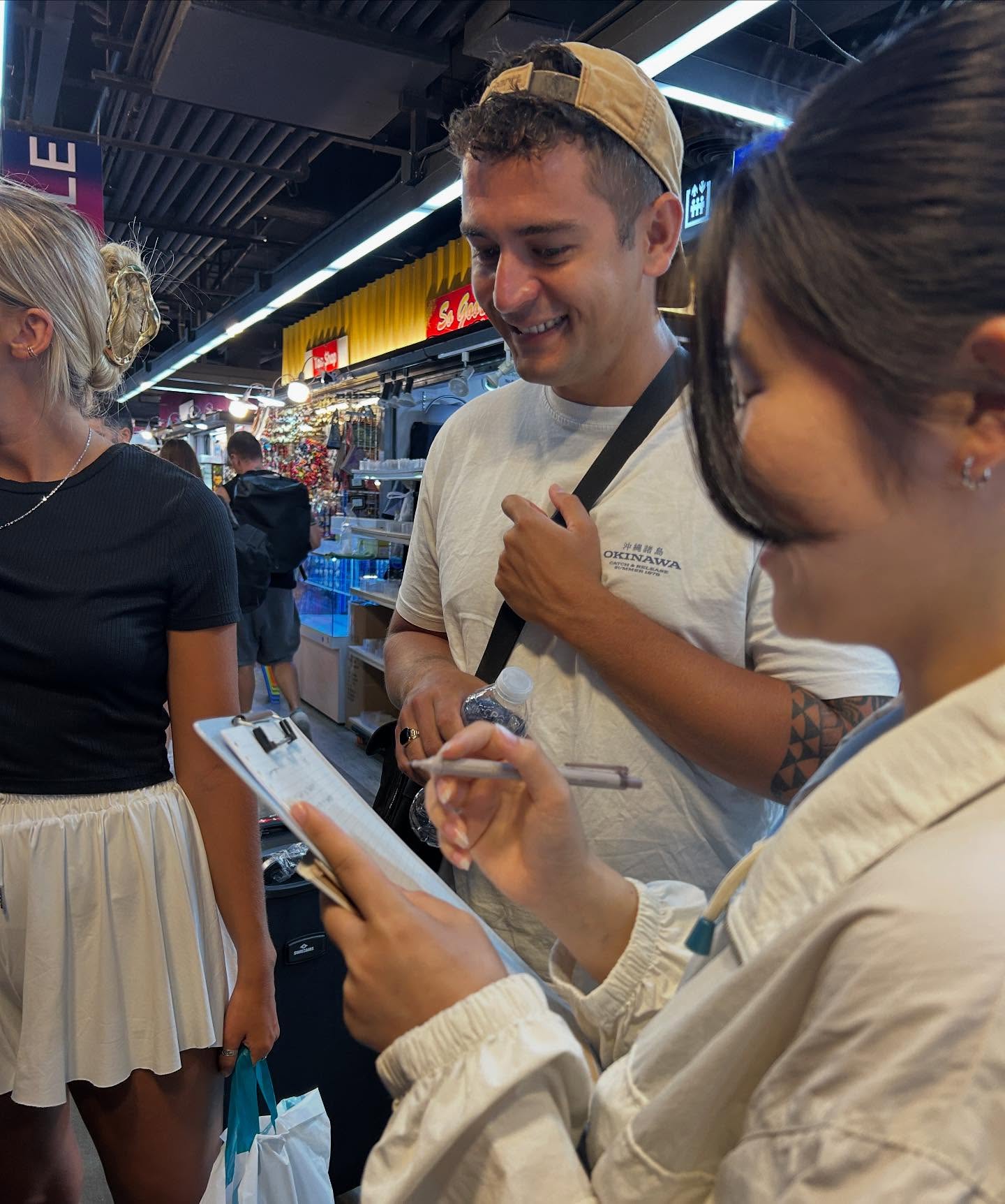 群馬発のグローバル企業・コシダカホールディングス様が運営する「まねきねこ」からもミッションをいただきました。観光客へのインタビューやアンケート調査を通して、市場ニーズの調査に挑戦。タイ語の環境に慣れた学生たちにとって、英語での調査は驚くほどスムーズだったようです。